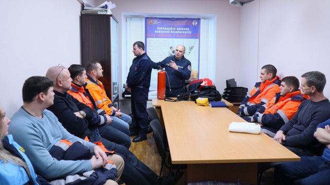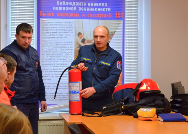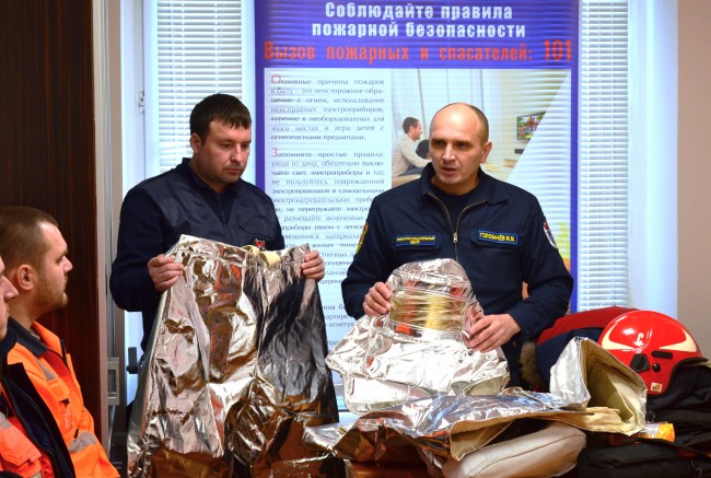 Михаил Головачёв рассказал участникам занятия о самом понятии, классификации, видах и опасных факторах пожара. Разобрал случаи, в том числе и из собственной практики, аварийных ситуаций и основных причин возникновения пожаров в резервуарах и резервуарных парках, в административных зданиях и на складах нефтепродуктов. Пожарный напомнил о мерах пожарной безопасности при устройстве электропроводки, использовании сложных технических изделий в административных и служебных помещениях. Собравшиеся подтвердили на практике знание правил использования ручных пожарных извещателей, первичных средств пожаротушения и самоспасателей, рассмотрели теплоотражательный костюм пожарного (ТОК-200), изучили при каких температурах применяется данное изделие.