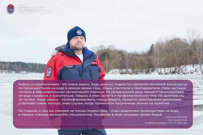 «Когда меня спрашивают, как себя вести на зимнем льду, я всегда отвечаю категорично – не выходите на него, как бы не хотелось срезать дорогу к дому или с ветерком прокатиться на снегоходе. Это только кажется, что лёд крепкий. Несмотря на то, что на столичных водоёмах всегда есть информационные знаки, многие на них не обращают внимания. Как часто я слышу эту фразу – всю жизнь через этот пруд зимой хожу, ничего со мной не случится. К сожалению, несчастные случаи зимой не редкость».