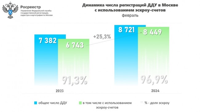 В феврале 2024 года Управлением Росреестра по Москве зарегистрировано 8 449 договоров долевого участия, оформленных с использованием эскроу-счетов, что составило 96,9% от общего числа договоров на первичном рынке (8 721 ДДУ). Об этом сообщил руководитель Управления Росреестра по Москве Игорь Майданов.