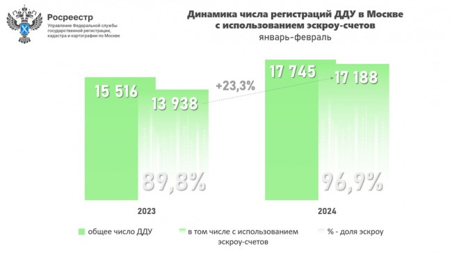 В январе-феврале текущего года зарегистрировано 17 188 ДДУ с эскроу-счетами, что составило 96,9% от всех сделок с «первичкой». Показатель на 23,3% превышает результат двух месяцев прошлого года.
