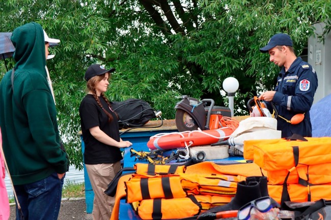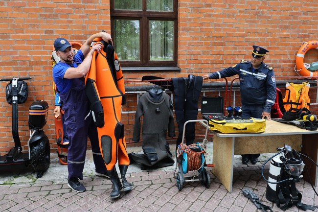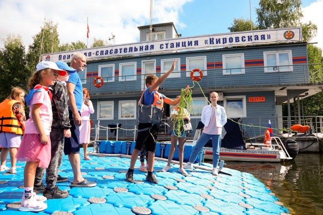 На станциях подросткам показывают технику, оборудование и снаряжение, которое используют при спасении людей на водных объектах столицы, — это костюмы для погружения на глубину, спасательные круги, кислородные баллоны, маски и ласты.