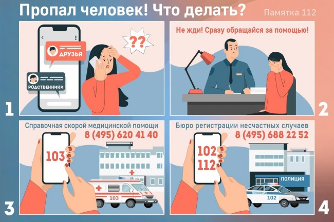 - также вы можете обратиться за информацией в справочную скорой медицинской помощи города Москвы, чтобы узнать, не поступал ли ваш родственник в больницу: 8 (495) 620-41-40 или в Бюро регистрации несчастных случаев: 8 (495) 688-22-52