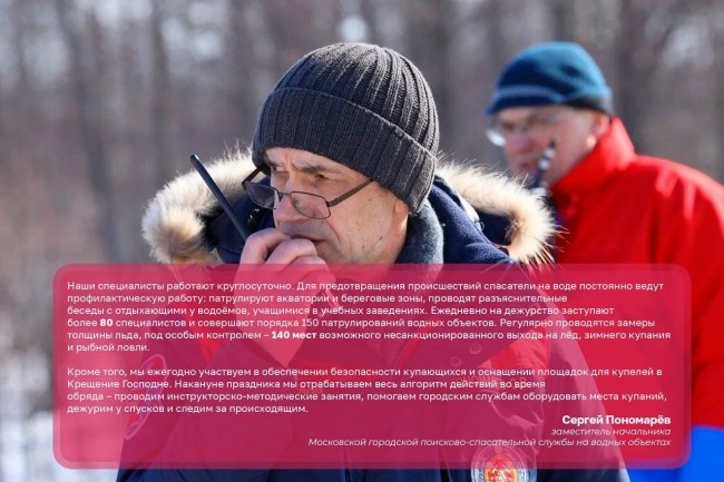 Сергей Валентинович Пономарёв, заместитель начальника Московской городской поисково-спасательной службы на водных объектах, рассказал о том, какими предписаниями руководствуются спасатели зимой и как обеспечивают безопасность на воде.