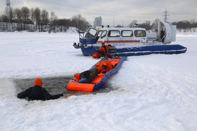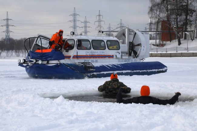 Помогает в работе особая техника. Зимний флот московских спасателей – свыше 25 судов на воздушной подушке. Этот уникальный транспорт способен передвигаться по воде и льду со средней скоростью 50-80 км/ч, он укомплектован всеми необходимыми средствами спасения.