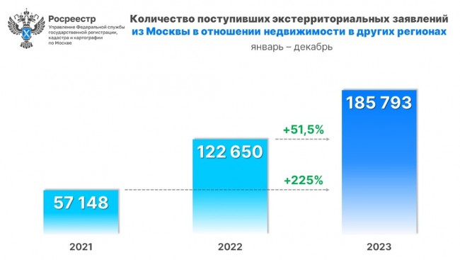 В прошлом году число оформленной жителями столицы недвижимости в других регионах по экстерриториальному принципу увеличилось на 51,5% по сравнению с 2022 годом (122 650), а к 2021 году, когда поступило 57 148 таких заявлений, данный показатель вырос в 3 раза (+225,1%).