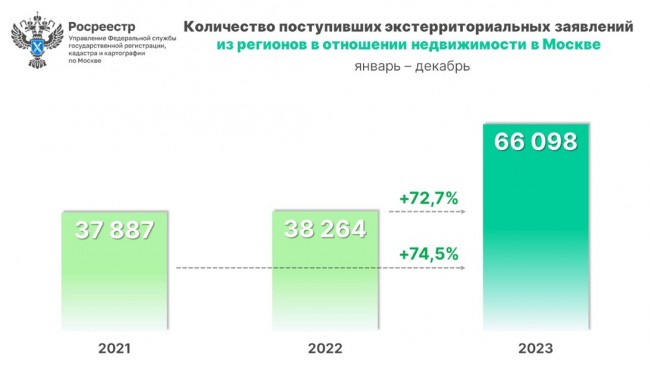Из других регионов на оформление недвижимости в Москве Управлением принято 66 098 заявлений по экстерриториальному принципу, что на 72,7% выше аналогичных показателей 2022 года (38 264).