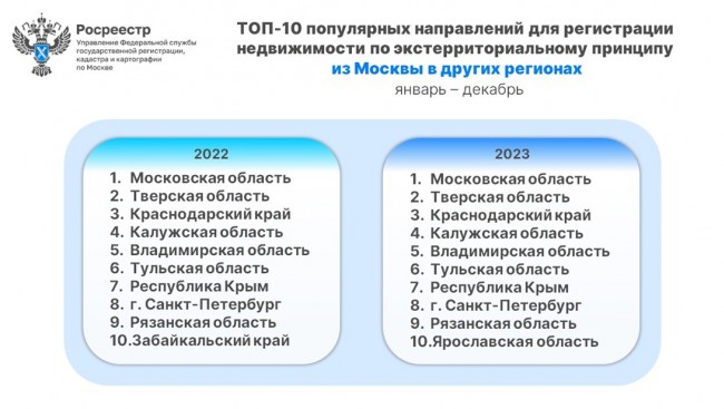 «За год число экстерриториальных обращений увеличилось более чем в полтора раза за счет возможности подачи документов через многофункциональные центры по всей стране. При этом предпочтения жителей столицы в отношении других регионов на протяжении двух лет остаются неизменными, за исключением десятой позиции, где Забайкальский край уступил место Ярославской области. Если смотреть в процентном соотношении, то на долю Подмосковья, с учетом возросшего интереса к ИЖС, в прошлом году пришлось 77,5% заявлений, в Тверской области и Краснодарском крае по 4% и 3,5% соответственно», — пояснил Игорь Майданов, руководитель Управления Росреестра по Москве.