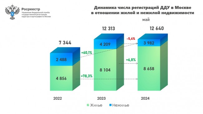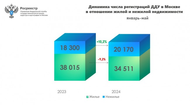 Всего за пять месяцев 2024 года в столице оформлено 54 681 ДДУ на рынках жилья (34 511 ДДУ) и нежилья (20 170 ДДУ). При этом, если жилая недвижимость уступила прошлому году (38 015 ДДУ) на 9,2%, то нежилой сегмент показал рост на 10,2% к пяти месяцам 2023 года (20 170 к 18 300 ДДУ соответственно).
