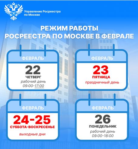Управление Росреестра по Москве в связи с празднованием Дня защитника Отечества – 23 февраля 2024 года, информирует граждан о режиме работы ведомства в период с 22 по 26 февраля текущего года.