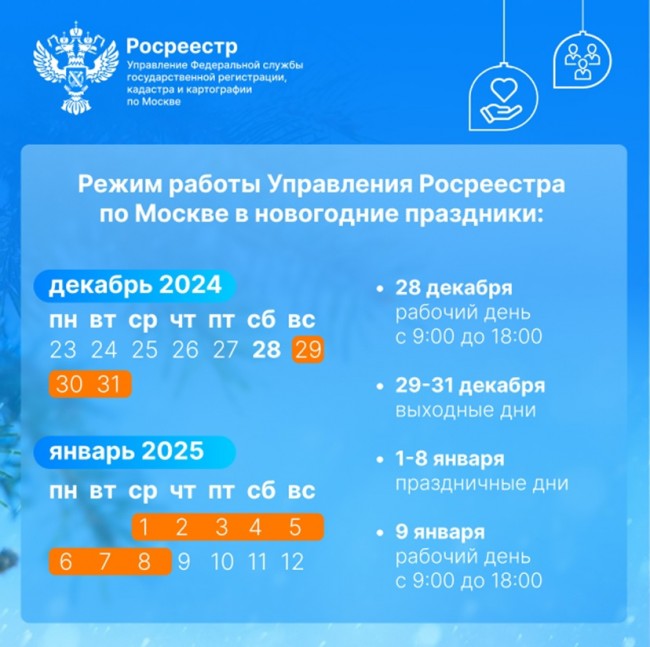 В связи с праздничными днями Управление Росреестра по Москве информирует о режиме работы в период с 28 декабря 2024 года по 9 января 2025 года: