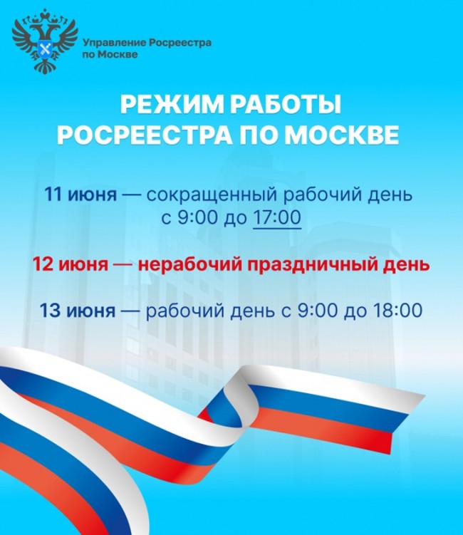 В связи с празднованием 12 июня Дня России, Управление Росреестра по Москве информирует о графике работы в период с 10 по 13 июня 2024 года.