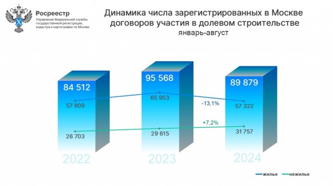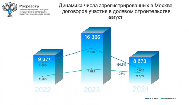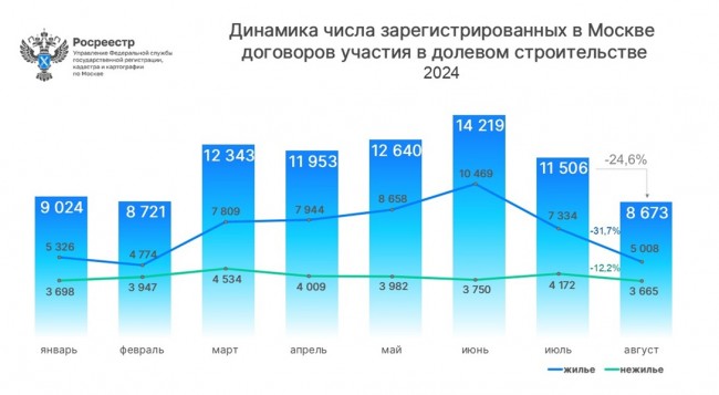 В августе 2024 года Управлением Росреестра по Москве зарегистрировано 8 673 договоров долевого участия в строительстве в отношении жилой и нежилой недвижимости. что на 24,6% меньше июля текущего года (11 506 ДДУ).