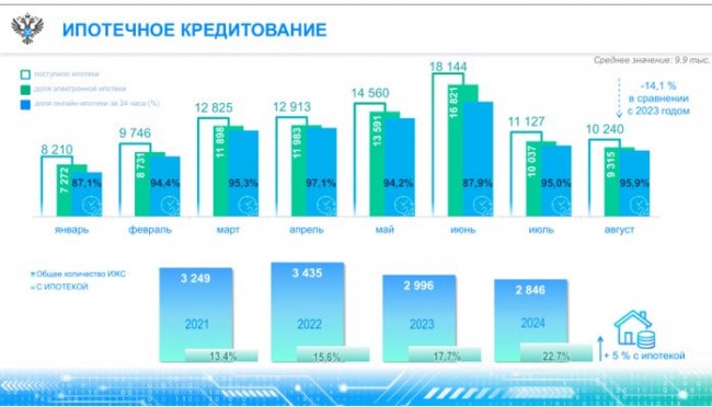 Так, за 8 месяцев текущего года поступило 97 765 заявлений на регистрацию ипотечных сделок. При этом доля заявлений в электронном виде составила 91,7% (89 648). По сравнению с аналогичным периодом 2023 года (85,7%) рост доли составил 6%. Также стабильно высокий результат показал реализуемый Управлением Росреестра по Москве проект «Электронная ипотека за 24 часа». Доля таких сделок сохраняется на уровне более 93% второй год подряд, а в августе установлен максимальный с начала года результат – 95,9% поступающих заявлений рассматриваются менее чем за сутки.