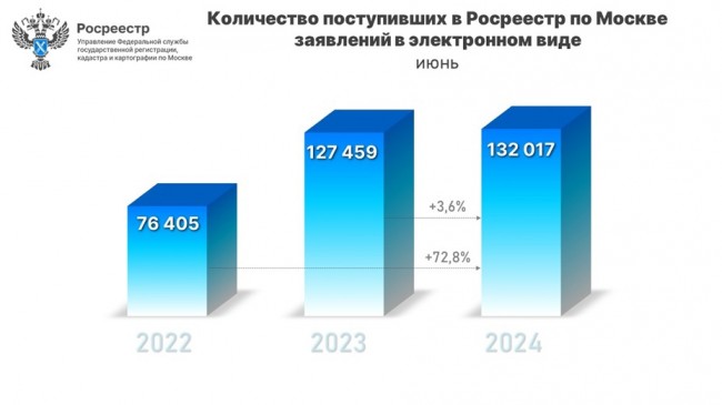 В июне 2024 года в Управление поступило 132 017 заявлений в электронном виде – на 3,6% выше аналогичного показателя прошлого года, когда было зарегистрировано 127 459 заявлений и на 72,8% больше, чем в июне 2022 года (76 405 заявление). При этом к маю 2024 года (136 912 заявление) отмечается снижение на 3,6%.