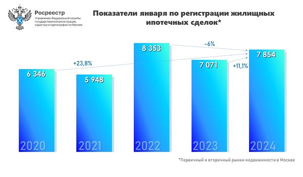 В январе 2024 года Управлением Росреестра по Москве зарегистрировано 7 854 договора ипотечного жилищного кредитования на первичном и вторичном рынках недвижимости. Об этом сообщил руководитель Управления Росреестра по Москве Игорь Майданов.