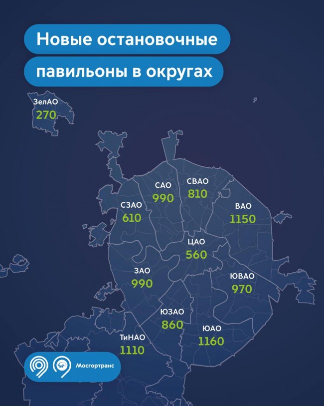 В карточке показали, сколько всего новых остановок установлено в каждом округе.
