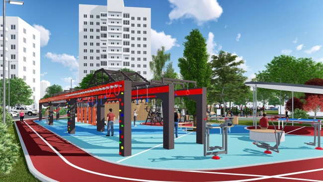 Здесь обустроят современное многофункциональное спортивное ядро с площадками для занятий воркаутом, стритболом и настольным теннисом, футбольным полем и беговой дорожкой по его периметру и зоной с лабиринтом и батутами для детей. Частью этого спортивного ядра станет рама для гонок с препятствиями в стиле «русский ниндзя» со множеством тренажеров.