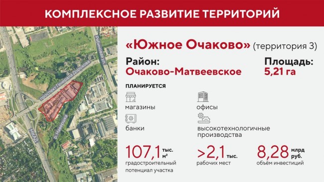«Приняли решение о комплексном развитии участка бывшей промзоны «Южное Очаково», территория 3. Он расположен на западе Москвы, между проспектом Генерала Дорохова, МКАД и рекой Навершкой. Его площадь - 5,21 га», - написал мэр в своем Telegram-канале.