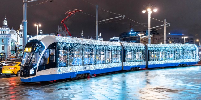 Поезда метро, автобусы, трамваи и электробусы празднично оформлены, на станциях и вестибюлях метро в Москве разместили световые инсталляции и арки, елки и хвойные гирлянды, плакаты и стикеры.