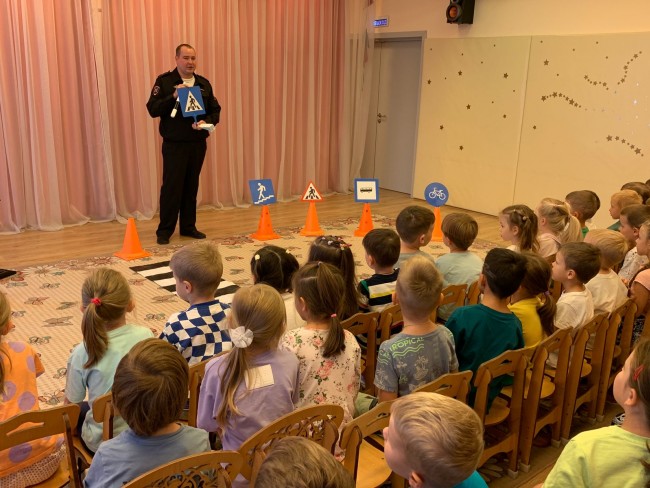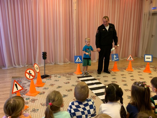 Сотрудники ГИБДД в игровой форме рассказали детям о Правилах дорожного движения, об особенностях безопасного поведения детей-пешеходов на дороге в осенний период время года и о том, что кататься на велосипедах и самокатах можно только там, где это безопасно, всегда использовать защитную экипировку, а переходить дорогу обязательно пешком.