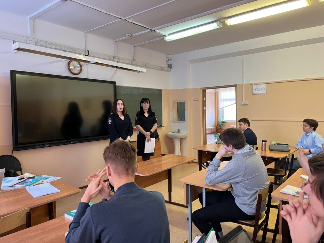 Представитель отделения по работе с личным составом Александра Васкеева предложила учащимся получить высшее образование в ведомственных вузах МВД России, обозначив преимущества и актуальность юридической профессии, а также возможность последующего трудоустройства в органы внутренних дел.
