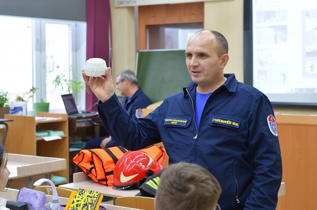 В эту среду к восьмиклассникам «Школы № 41 имени Григория Алексеевича Тарана» на открытый урок пришли заместитель начальника отряда - начальник группы по профилактической работе ПСО № 206 Михаил Головачёв и главный специалист Алексей Довидсон.