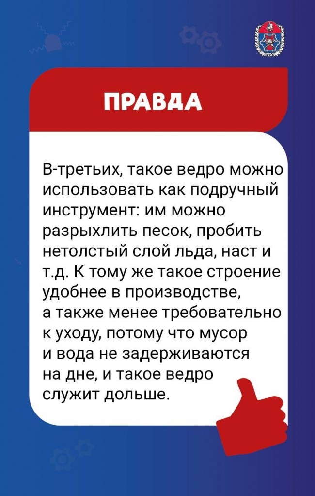 - Во-первых, это удобство забора воды: ведро такой формы быстрее погружается в воду и зачерпывает её, а это очень важно при тушении пожара, где на счету каждая секунда;