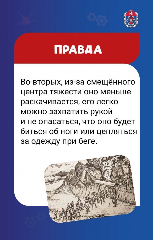 - Во-вторых, из-за смещённого центра тяжести оно меньше раскачивается, его легко можно захватить рукой и не опасаться, что оно будет биться об ноги или цепляться за одежду при беге;