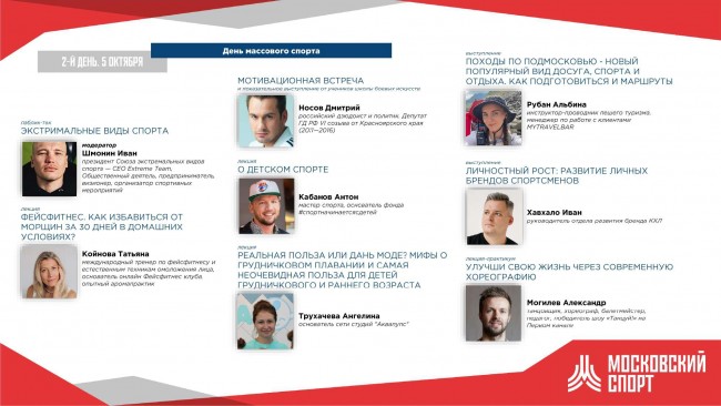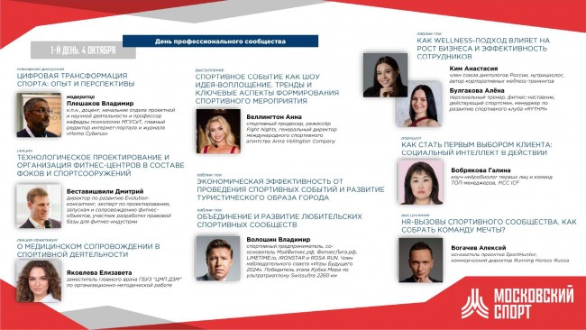 4 октября профессиональные спикеры расскажут о wellness-подходе в бизнесе, о том, как научить детей любить спорт и внедрить тег-регби в московские дворы, о запуске собственного экобренда в спорте, о технологическом проектировании и организации фитнес-центров в составе ФОКов, о цифровой трансформации спорта, цифровизации спортивных объектов, экологии и технологиях в производстве спортивной одежды, проведении ярких спортивных мероприятий, организации эффективной работы команды. А вечером в рамках культурной программы Театр сторителлинга Константина Кожевникова представит спектакль «Москва: любить нельзя оставить».