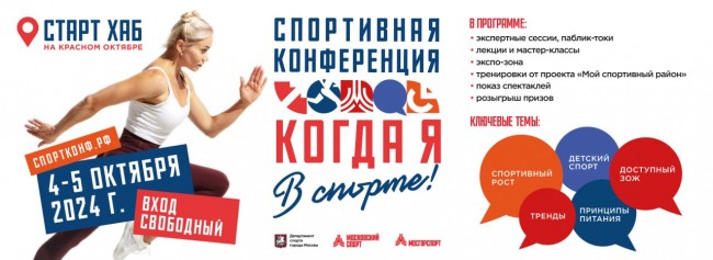 Как и в прошлом году конференция поделена на два тематических дня. День, посвященный профессиональным аспектам спорта – 4 октября (пятница), а 5 октября (суббота) двери Старт Хаба откроются для всех любителей активного образа жизни любого возраста. Мотивационные истории, самые интересные тренды, интерактивы, показы фильмов, актуальные темы и полезные советы от экспертов в своей области ждут москвичей на конференции «Когда я в спорте!».