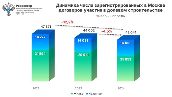 В январе-апреле 2024 года Управлением Росреестра по Москве зарегистрирован 42 041 договор долевого участия в строительстве в отношении жилой и нежилой недвижимости. Данный показатель уменьшился на 4,5% по отношению к четырем месяцам 2023 года (44 002 ДДУ) и на 12,2% снизился к 2022 году (47 871 ДДУ).