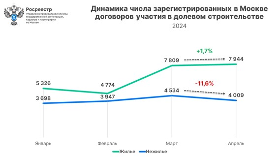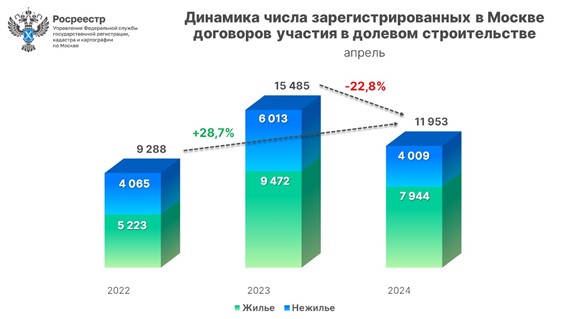 В апреле 2024 года Управлением Росреестра по Москве зарегистрировано 11 953 договора долевого участия в строительстве в отношении жилой и нежилой недвижимости, что на 3% меньше результата марта (12 343 ДДУ).
