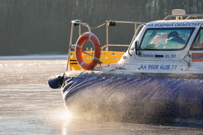 Спасатели патрулируют водные акватории на более 20 судах на воздушной подушке, которые способны передвигаться по воде и льду со средней скоростью 50-80 км/ч.