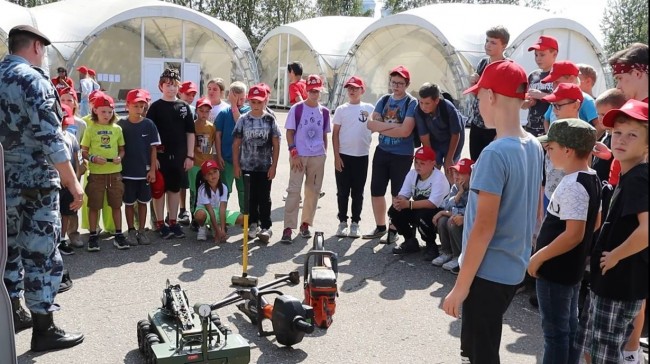 В завершении занятия инженер-сапёр ОМОН «Авангард» продемонстрировал детям экипировку и технические средства, которые стоят на вооружении спецподразделения.