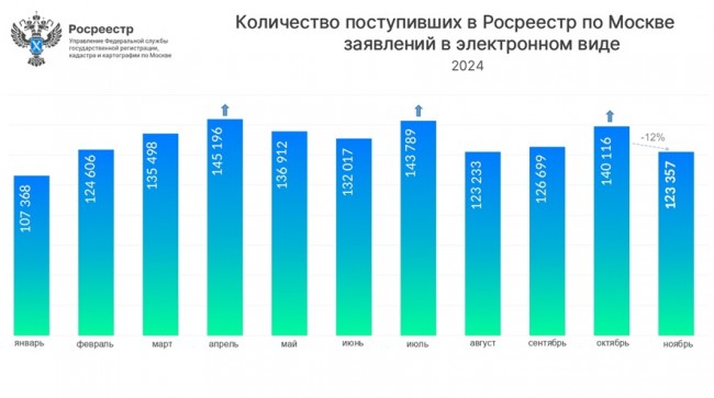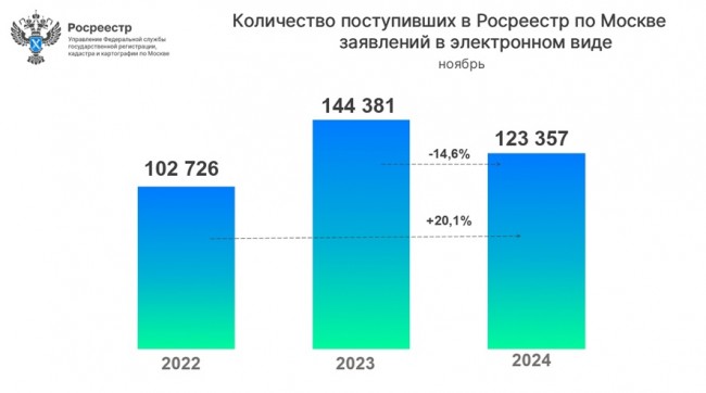 В ноябре 2024 года в Управление Росреестра по Москве поступило 123 357 онлайн-заявлений. К ноябрю 2023 года (144 381) показатель снизился на 14,6%, в то же время рост к ноябрю 2022 года (102 726) составил 20,1%.