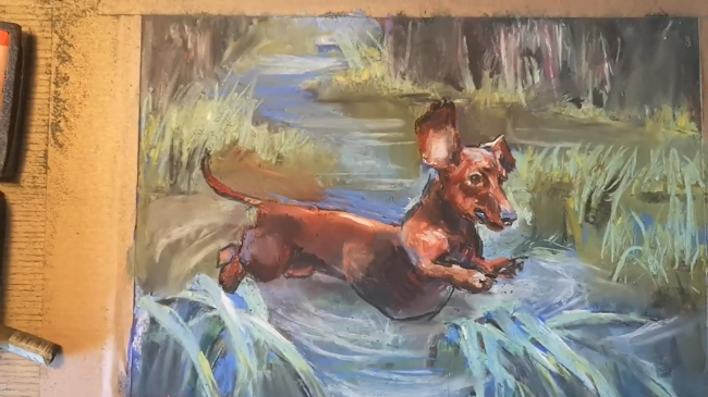Нарисовав собаку пастельными мелками, художник приступила к изображению фона: