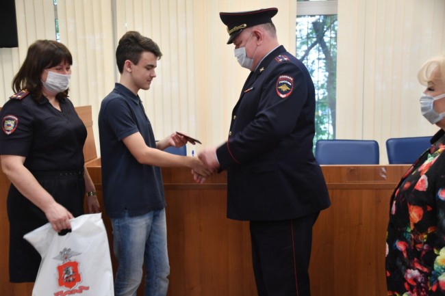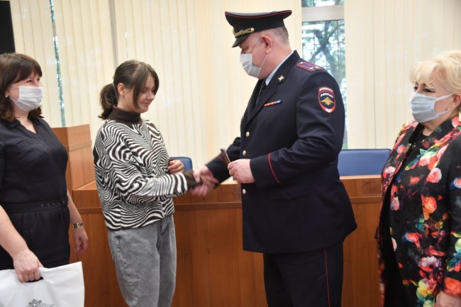 Подполковник полиции Александр Серба, передавая лично в руки удостоверения личности, вместе с поздравлениями рассказывал юношам и девушкам о возможности поступления в профильные высшие учебные заведения МВД России.