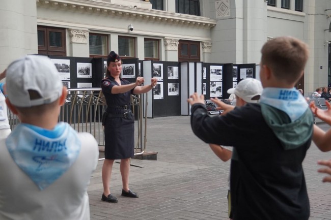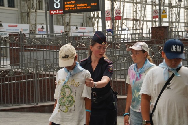 В рамках общероссийской акции «Зарядка со стражем порядка» старший инспектор по делам несовершеннолетних линейного подразделения капитан полиции Мария Деева и инспектор группы охраны общественного порядка лейтенант полиции Салават Фатхутдинов, обеспечивающие безопасность деток, направлявшихся дневным поездом со столичного Киевского вокзала в летний лагерь Анапы, устроили для юных пассажиров спортивную разминку.