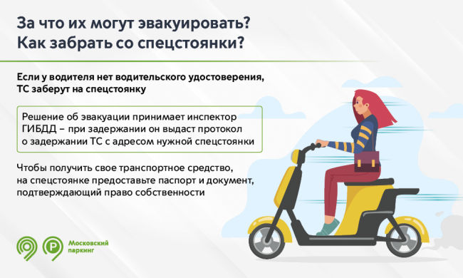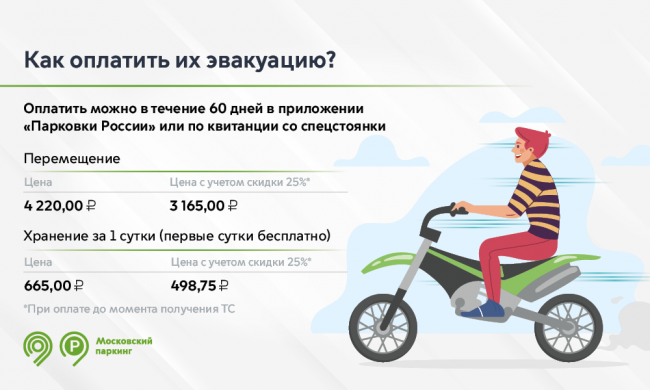 На спецстоянках для получения своего мопеда необходимо предоставить паспорт и документ, подтверждающий право собственности. Стоимость перемещения составит 4 220 руб., хранения – 665 руб. (первые сутки – бесплатно). Оплатить эвакуацию можно в приложении «Парковки России» или по квитанции со спецстоянки в течение 60 дней после получения транспортного средства. Если произвести оплату до получения, будет предоставлена скидка 25%.