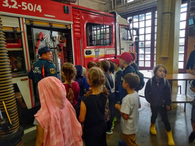 Экскурсия прошла под руководством старшего инструктора-пожарного Романенкова Алексея. Ребята пришли подготовленными, зная о том, что труд пожарного героический, и они в любую секунду готовы прийти на помощь. Дети уже знают номера телефонов экстренных служб «01» и «112», а во время экскурсии выучили новый номер «101». Они также знают, что прятаться во время пожара нельзя, а нужно звать на помощь взрослых.