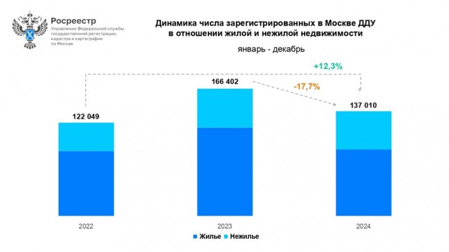 В январе-декабре 2024 года в Москве зарегистрировано 137 010 договоров участия в долевом строительстве в отношении жилой и нежилой недвижимости. По сравнению с рекордом 2023 года (166 402 ДДУ) показатель уменьшился на 17,7%, а к аналогичному периоду 2022 года (122 049 ДДУ) зафиксирован рост на 12,3%.