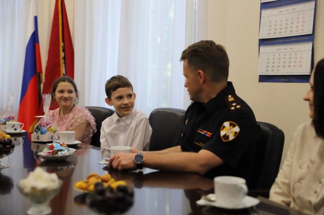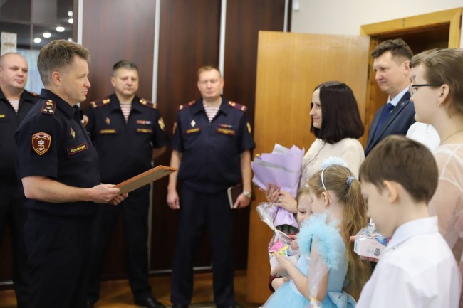 В торжественной обстановке начальник вневедомственной охраны Главного управления Росгвардии по г. Москве полковник полиции Александр Романенко поздравил семью дежурного группы обеспечения служебной деятельности нарядов вневедомственной охраны старшего лейтенанта полиции Надежду Бондаренко.