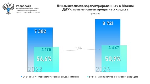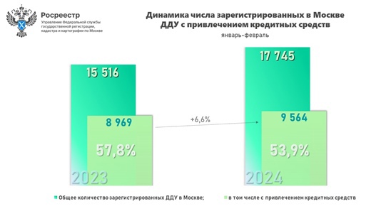 В феврале 2024 года Управлением Росреестра по Москве зарегистрировано 4 437 договоров долевого участия в строительстве жилой и нежилой недвижимости с привлечением кредитных средств. В годовом выражении показатель увеличился на 6,3% – 4 175 таких договоров было зарегистрировано в феврале 2023 года.