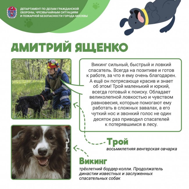 Собаки-спасатели есть в столичном Пожарно-спасательном центре. (https://vk.com/gkupsc) Кинологические расчёты являются неотъемлемой частью в обеспечении комплексной безопасности столицы.