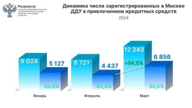 В марте 2024 года Управлением Росреестра по Москве зарегистрировано 6 856 договоров долевого участия в строительстве жилой и нежилой недвижимости с привлечением кредитных средств. Данный показатель увеличился на 54,5% по сравнению с февралем (4 437 ДДУ).