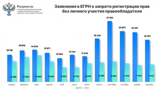 В декабре 2023 года специалистами Управления принято 18 797 заявлений о запрете проведения сделок без личного участия правообладателя, что в 2,4 раза превысило декабрьский показатель 2022 года (7 943).