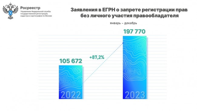 Управлением Росреестра по Москве в январе-декабре 2023 года оформлено 197 770 заявлений о невозможности государственной регистрации прав без личного участия правообладателя или его законного представителя. По сравнению с 2022 годом, когда в реестр было внесено 105 672 таких заявления, число обращений выросло на 87,2%.