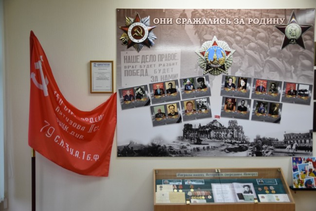 Самое почетное место на выставке занимает Знамя Победы. Копия Знамени была вручена ветеранской организации центра и с тех пор находится в музее.