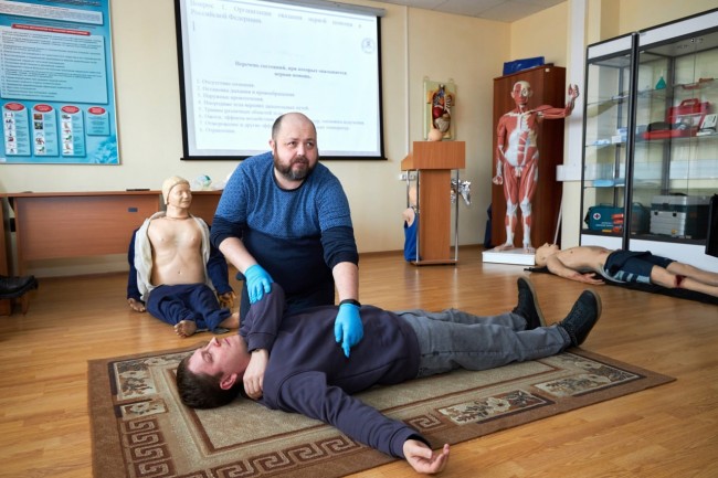 Андрей Потребич, старший преподаватель центра, проводит с группами занятие по оказанию первой помощи:
