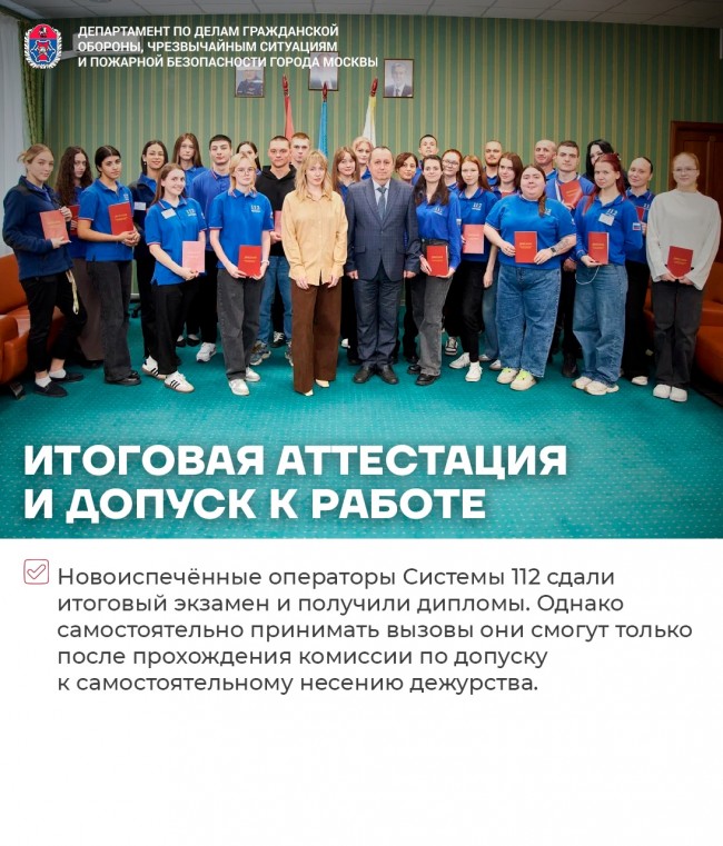 В Учебном центре ГО и ЧС Москвы успешно завершилось обучение очередной группы будущих специалистов по приёму и обработке экстренных вызовов Службы 112 Москвы. Позади 110 часов теории и 135 – практики.